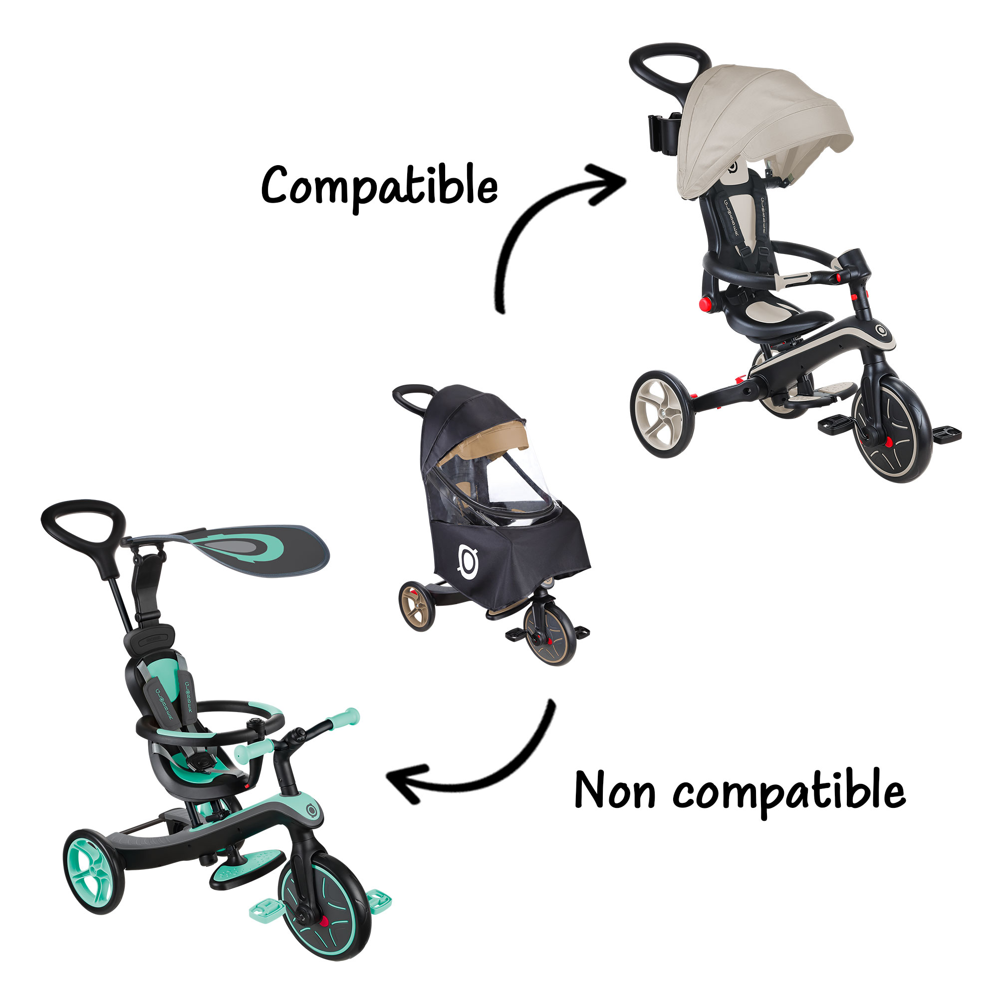 Protection pluie pour tricycle Globber. Elle est compatible avec tous les tricycles possédant un canopy, à savoir les Explorer des gammes non pliables (634, 637, 636) et pliables (732). Elle n'est pas compatible avec les anciens modèles de tricycles possédant un pare-soleil.