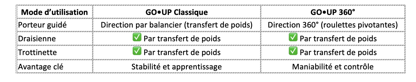 Les nouveaux modèles GO•UP 360° introduisent une véritable révolution avec leur système de direction pivotant. Sous le plateau, un module amovible muni de roulettes pivotantes permet une direction à 360°, contrôlée directement par le parent en mode porteur.