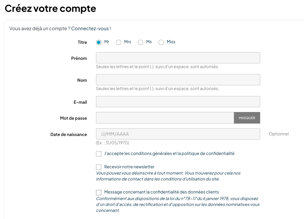 Merci de renseigner un mot de passe avec au minimum 6 caractères. A la création de compte il vous sera demandé d'accepter les conditions générales de vente, et la politique de confidentialité des données clients.